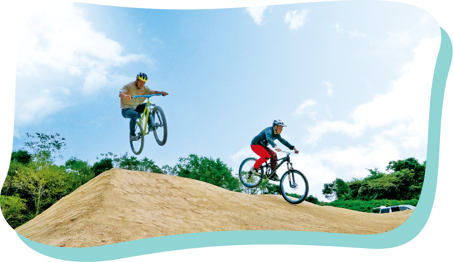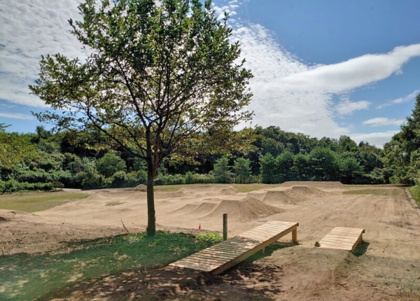 小さいジャンプはキックバイクでの走行も可能。また全体的に、フルサスやebikeでも飛べる設計で、上達すれば漕ぎなしで3連全部飛び切れます。また、エアトリックや初心者の練習に適した形状なので、恐怖心もなくで楽しめます。